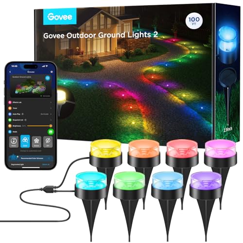 Govee Outdoor Ground Lights 2, 100ft for Patio Decorations, 30 Pack RGBIC Pathway with 100LM Warm White, IP67 Waterproof for Garden, Splitter Connector, Works with Alexa, Google Assistant