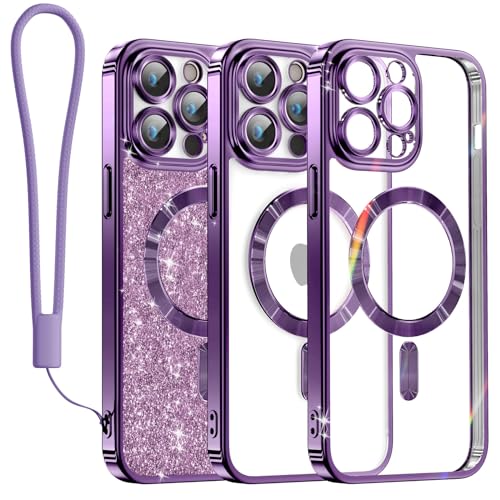 Meifigno Candy Mag Series Case Designed for iPhone 14 Pro Max, [Compatible with MagSafe][Glitter Card & Wrist Strap] Full Camera Lens Protection Designed for iPhone 14 Pro Max Case Women, Purple