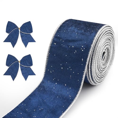 Estivaux 2.5 Inch × 10 Yard Christmas Navy Blue Ribbons for Crafting, Xmas Wired Edge Ribbon Glitter Blue Velvet Craft Ribbons for Gift Wrapping Christmas Decorations Supplies