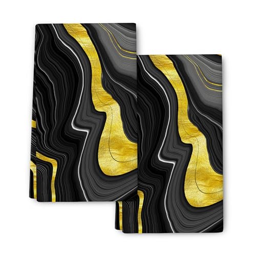 Pintukee Black Gold Kitchen Towels Set of 2, Marble Texture Decorative Dish Hand Towels for Bathroom Bar Abstract Modern Absorbent Drying Cloth 16x24 Inch, Black Gold Kitchen Decor