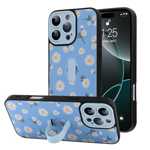BF2JK for iPhone 16 Pro Case with Finger Hand Strap Kickstand, Cute Aesthetic Daisy Floral Flower Phone Case for Women Men, Full Camera Protection Shockproof Cover, Blue