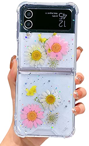 Abbery for Samsung Galaxy Z Flip 3 5G Case Clear with Design Glitter Cute Floral Stars Moon Sparkle TPU & PC Transparent Dried Real Flower Aesthetic Case for Samsung Galaxy Z Flip 3 (Daisy Flower)