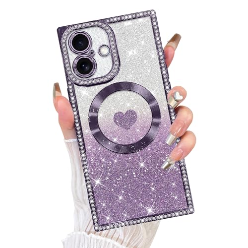 Fiyart Designed for iPhone 16 Case,Compatible with MagSafe Love Hearts Plating Soft Slim TPU Sparkle Rhinestone Glitter Shockproof Phone Bumper for Women Girls 6.1"-Purple