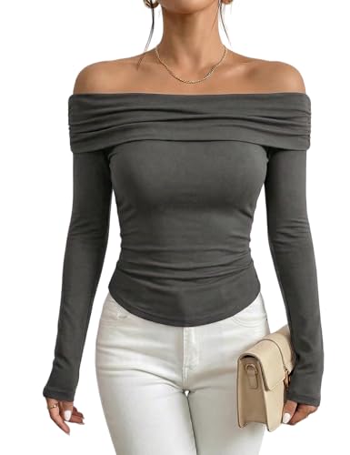 Prettywear Women's Sexy Off Shoulder Tops Dressy Casual Long Sleeves Going Out Nightout Shirt(Grey,XS)