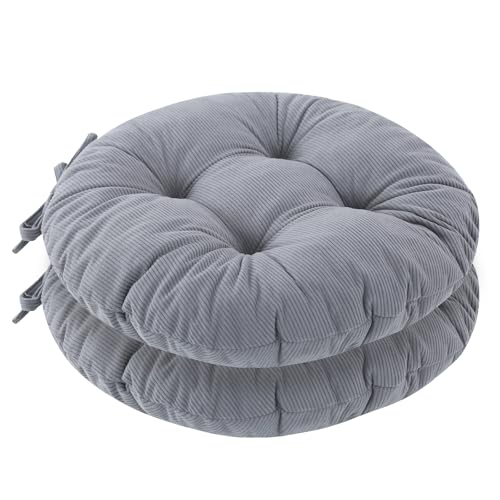 idee-home Round Chair Cushions Set of 2, Round Stool Seat Cushion 16 inch, Circle Chair Pads Corduroy with Ties Indoor Barstool Pads for Kitchen, Light Grey