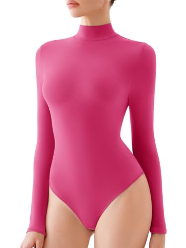 REORIA Women's Mock Turtleneck Body Suits Long Sleeve Bodysuits Fall Winter Soft Basic Slim Tight Layering Tops Trendy Y2K Valentine Outfits(Rose Pink X-Small)