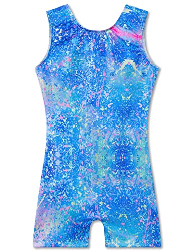 TENVDA Girls Leotards for Gymnastics Outfit Size 3t 4t Sparkly Blue Graffiti Print Comfy Tumbling Biketard Unitards with Shorts