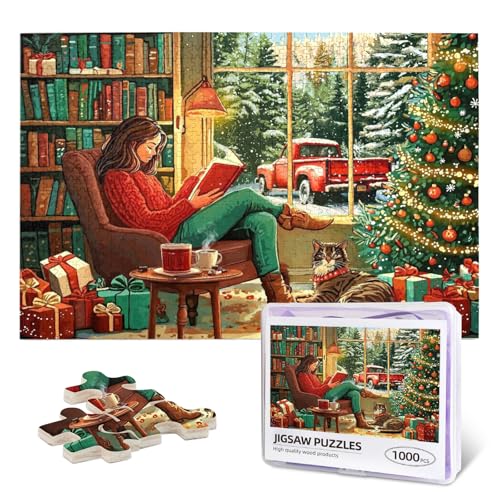 1000 Piece Wooden Jigsaw Puzzle for Adults - Cozy Christmas Reading Scene with Cat & Winter Wonderland, Festive for Book Lovers & Cat Enthusiasts