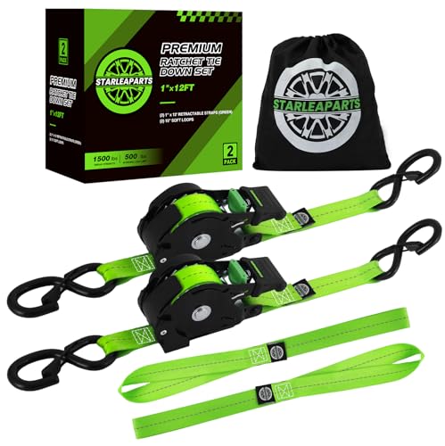 STARLEAPARTS Retractable Ratchet Straps(2PK 1.0INX12FT) - 1,500lb Break Strength, Ratchet Strap Heavy Duty with Rubber Coated Handle, Perfect Auto Ratchet Straps for Motorcycle, Kayak and Trucks