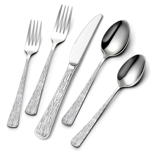 Yoehka 60-Piece Hammered Silverware Set for 12, Stainless Steel Flatware Set with Tree Pattern Handles, Mirror Polished Cutlery/Utensils Set for Home, Restaurant, Hotel, Dishwasher safe