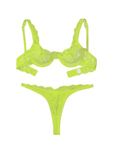Foxiny Petite Sexy Scallop Floral Lace Mesh Sheer Underwire Lingerie Set 2 Piece Women Push Up Matching Bra Panty Underwear Neon Green 2X-Small