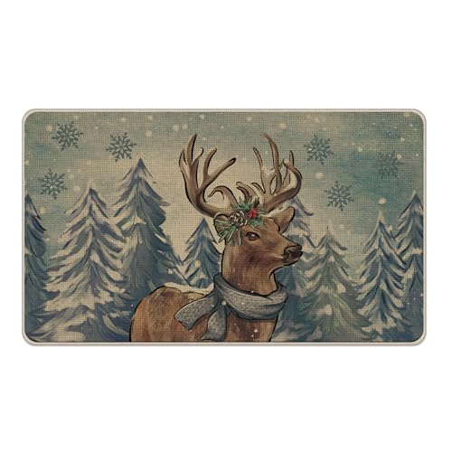 Livcoz Winter Reindeer Welcome Front Door Mat, Snowy Pine Tree Snowflake Decorative Doormat Non-Slip Floor Entryway Rug, Christmas Seasonal Indoor Outdoor Home Kitchen Decoration 17x29 Inches