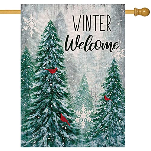 Artofy Winter Welcome Pine Trees Home Decorative House Flag, Cardinal Red Bird Garden Yard Snowy Forest Outside Decor, Christmas Snow Snowflakes Farmhouse Outdoor Large Decoration Double Sided 28 x 40