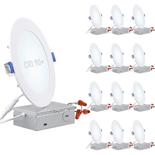 TORCHSTAR Basic Series 12-Pack 6 Inch Ultra-Thin LED Recessed Lighting with Junction Box, CRI90, Aluminum, 5000K Daylight, 5%-100% Dimmable Slim Recessed Downlight, 12W 1100LM, ETL and Energy Star