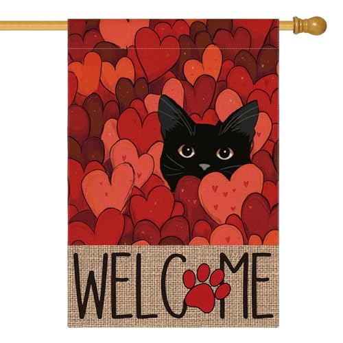 AVOIN colorlife Valentines Day House Flag 28x40 Inch Double Sided Outside, Black Cat Love Hearts Welcome Yard Outdoor Flag