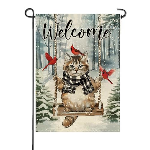 Artofy Welcome Winter Tabby Cat Small Decorative Garden Flag, Snowy Forest Swing Cardinal Yard Lawn Outside Decor Pet Owner Lover Gift, Christmas Burlap Outdoor Home Decoration Double Sided 12 x 18