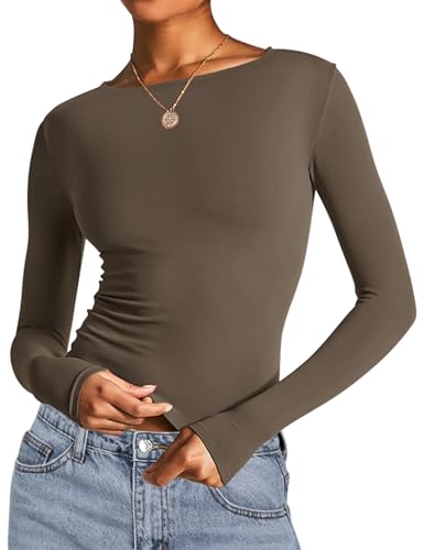 AKEWEI Womens Long Sleeve Shirts Spring Summer Fashion 2026 Crop Tops Basic Layering Workout Slim Fitted Y2K Clothes (Otter Brown, M)