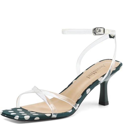 AIUNIIND Women's Sandals Square Open Toe Kitten Heels Strappy Ankle Strap Sandals for Women Comfort Dress Party Shoes Green polka dot 7