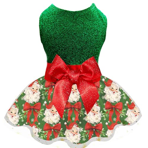 Christmas Dog Dress, Festive Holiday Pet Outfit, Shiny Green Top with Glittery Red Bow and Santa Claus Print Skirt