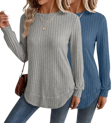 Bliwov Women Long Sleeve Shirts Crewneck Tunic Tops Loose Fit Fall Sweaters Clothes Outfits Fashion Pullover Dressy Blouses Blue,grey