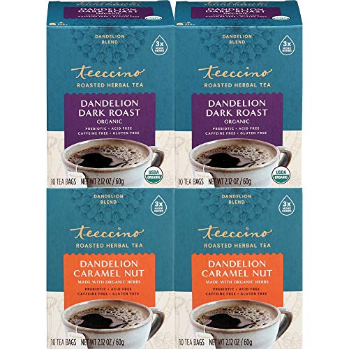 Teeccino Dandelion Dark Roast and Dandelion Caramel Nut Tea Variety Pack - Caffeine-Free, Roasted Herbal Tea with Prebiotics, Gluten Free - 10 Tea Bags (Pack of 4)