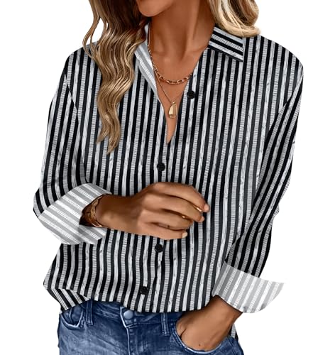 OFEEFAN Striped Long Sleeve Shirt Women Button Down Blouses Casual Tops Fashion Outfit Spring Summer Boho Clothes Print 7 XL