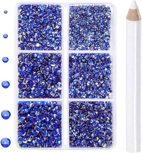 CMBYN 7200 Pieces 6 Mixed Sizes Glue Fix on Glass Rhinestones Round Crystal Gems Flatback for DIY Jewelry Making with one Picking Pen (6-Sizes 7200PCS, Sapphire)