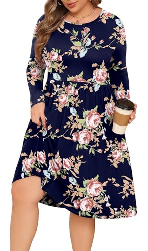 POSESHE Women's Plus Size Floral Home Casual Swing Midi Dresses Wedding Guest Dresses with Pockets,Rose Navy Blue,XL
