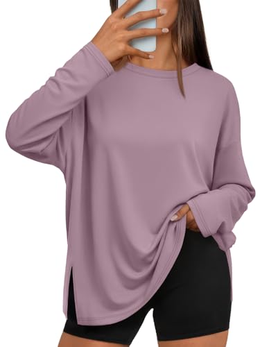 Trendy Queen Oversized Side Slit Tshirts for Women Long Sleeve Workout Tops Fall Fashion Gym Casual Tees Basic Y2K Clothes DarkPink S
