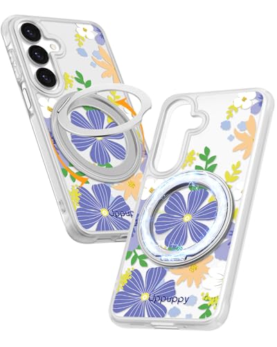 Uppuppy for Samsung Galaxy A16 4G/5G Case with 360° Rotatable Magnetic Ring - Semi-Transparent Anti-Fingerprint Soft-Touch Material Shockproof, Cute Purple Flower Design for Women Girl