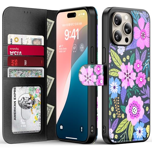 FUNMIKO for iPhone 14 Pro Case Wallet,Detachable Flip Folio Leather Cover,RFID Blocking 4 Card Slots Holder,Magnetic Kickstand,Protective Phone Shell for Women Girls,Vibrant Flowers