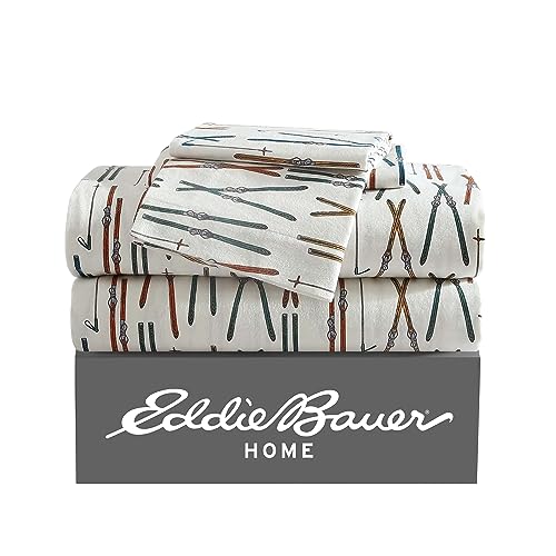 Eddie Bauer - Flannel Sheets King Size, Anti-Pilling & Wrinkle Resistant Cotton, Touchably Soft for All-Season Comfort - Bed Sheets with Matching Pillowcase & Fitted Sheet (Ski Line White)