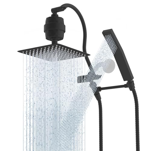 Hibbent All Metal 10'' Filtered Rainfall Shower Head Combo, High Pressure Handheld Shower Wand, 12'' Adjustable Extension Arm, 20 Stage Shower Filter, 71'' Hose, Shower Head Holders, Matte Black
