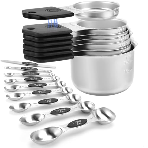 Magnetic Measuring Cups and Spoons Set-Heavy Duty 304 Stainless Steel,Double Measurement Markings,Set of 16 with Leveler for Measure Dry and Liquid Ingredients (Black)