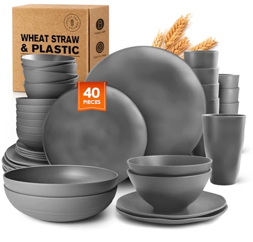 Teivio 40-Piece Flatware Kitchen Plastic Wheat Straw Dinnerware Set,Service for 8,Dinner Plates, Dessert Plate,Cereal Bowls,Pasta Bowls,Cups,Unbreakable Plastic Outdoor Camping Dishes,Irregular Gray