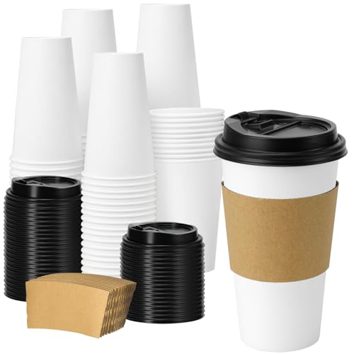 Clawsoff 50 Pack 20 oz Disposable Coffee Cups with Lids and Insulated Sleeves, Leak-free Paper and Sturdy Thick Paper Hot to Go Coffee Cups with Lids for Cold/Hot Beverage (White)