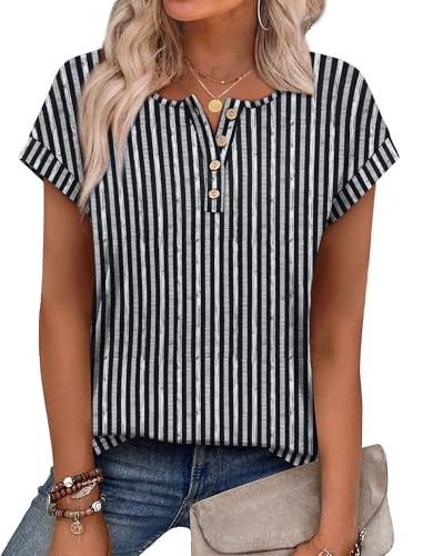 OFEEFAN Womens Tops Casual Henley Shirts for Women Striped Shirt Cap Sleeve Tops Business Casual Outfits Black and White Striped L
