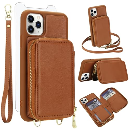 Phone Case for iPhone 11 Pro Max 6.5 Wallet Cell Cover with Tempered Glass Screen Protector Crossbody Strap Lanyard RFID Blocking Credit Card Holder iPhone11 11pro Promax i XI Plus Women Girls Brown
