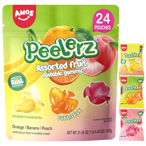 Amos Peelerz Assorted Peelable Gummy – Tropical Peeling Candy Variety Pack | Banana, Orange & Peach | 24 Individual Packs (608g) | Fun, Chewy & Shareable Treat