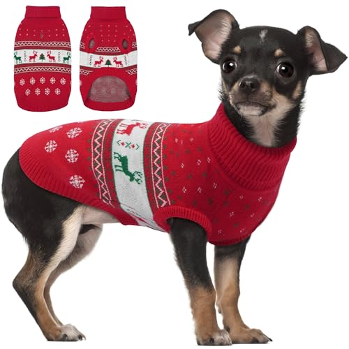PUMYPOREITY Dog Christmas Sweater with Leash Hole, Warm Turtleneck Dog Cable Knit Sweaters, Stretchy Pullover Pet Christmas Outfit for Cold Weather, Machine Washable, XS, Red