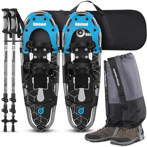Odoland 4-in-1 Snowshoes for Men and Women with Trekking Poles, Carrying Tote Bag and Waterproof Snow Leg Gaiters, Lightweight Aluminum Alloy Snow Shoes, Blue+Black, Size 25''