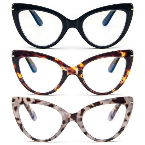 MMOWW Cat Eye Reading Glasses 3 Pairs Fashion Cute Blue Light Blocking Readers for Women, Black/Tortoise/Grey Powder +3.5