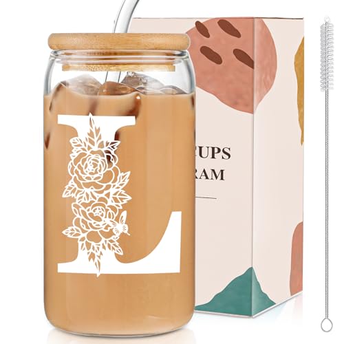 Christmas Gifts for Women: Initial Glass Cup as Office Graduation Memorial Holiday Personalized Gifts - for Mom Grandma Wife Girlfriend Sister Daughter Friend Christmas Gifts - L Aesthetic Cup