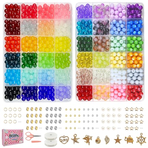 Dayify 1500 Pcs 8mm Glass Beads Bracelet Making Kit, 48 Colors Crystal Beads for Jewelry Making, Round Glass Beads with Charms for Bracelets and DIY Crafts (43 Solid Colors and 5 Mermaid Colors)