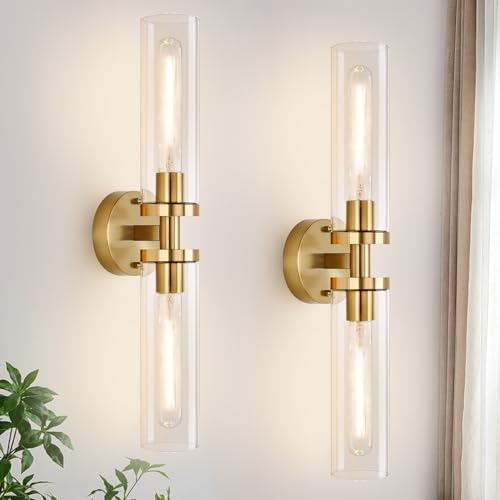 Wall Sconces Set of Two, Hardwired Brushed Gold Bathroom Sconces Wall Lighting with Clear Glass, Modern Sconces Wall Decor Set of 2 Bathroom Light fixtures for Mirror Hallway (Bulbs Not Included)