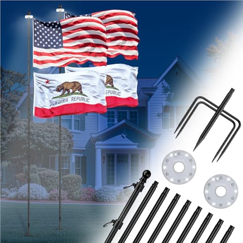 ZMTECH 12FT 2PACK Heavy Duty Flag Pole with Solar Light & 5 Pronges Base in Ground for Yard, Tangle Free Spinning Stainless Steel,Windproof, Fit for 2 Flags |Outside House Residential |Commercial