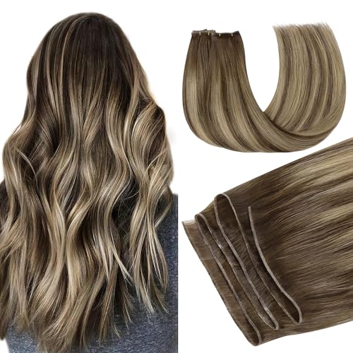 GOO GOO Genius Human Hair Extensions, Sew In Remy Weft, 4/27/4 Balayage Chocolate Brown to Caramel Blonde 22inch 60g, Hand Tied Weft