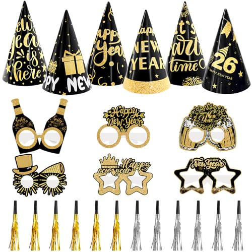 Openfly 24Pcs New Years Eve Party Supplies 2026 Including Happy New Year Cone Hats & NYE Eyeglasses & Metallic Fringed Noise Makers for New Year's Eve Party Decoration Favors