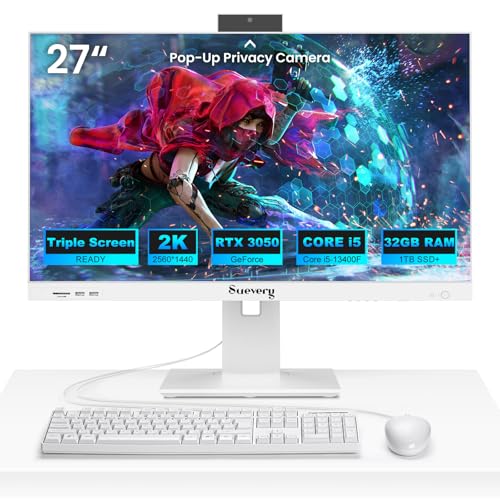 suevery All-in-One Desktop Computer,27" QHD 120Hz, Core i5-13400F, RTX 3050, 32GB RAM, 1TB SSD +, Triple Monitor Support, ErgoFlex Stand,Gaming and Office, Pop-Up Webcam,White AIO PC