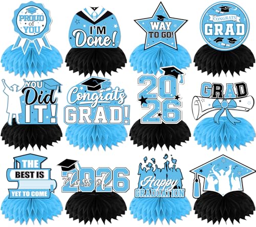 Sky Blue Graduation Decorations Honeycomb Centerpieces, 12Pcs Class of 2026 Graduation Centerpieces for Tables Light Blue Graduation Decorations 2026 Congrats Grad Graduation Table Decorations